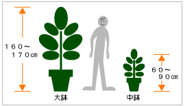 参考として、大鉢は、鉢を含む床からの高さがおよそ160cm〜170cm前後、中鉢は60cm〜80cm前後のものが多くございます。